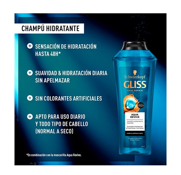 Gliss AQUA REVIVE proporciona: SENSAÇÃO DE HIDRATAÇÃO ATÉ 48H* CABELO BRILHANTE E COM ASPECTO SAUDÁVEL APTO PARA USO DIÁRIO, SEM PESAR, SEM CORANTES ARTIFICIAIS