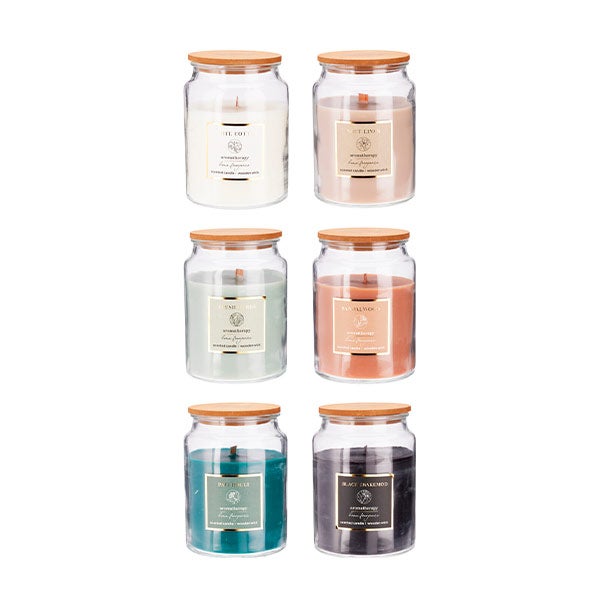 VELA PERFUMADA EM VIDRO TRANSPARENTE COM PAVIO DE MADEIRA, CERA COLORIDA.