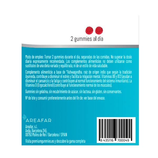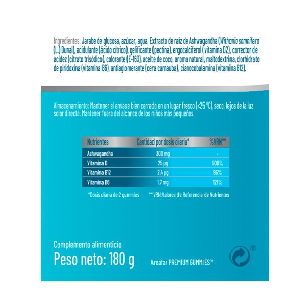 Jarabe de glucosa, azúcar, agua, Extracto de raíz de Ashwagandha (Withania somnifera (L.) Dunal), acidulante (ácido cítrico), gelificante (pectina), ergocalciferol (vitamina D2), corrector de acidez (citrato trisódico), colorante (E-163), aceite de coco, aroma natural, maltodextrina, clorhidrato de piridoxina (vitamina B6), antiaglomerante (cera carnauba), cianocobalamina (vitamina B12).