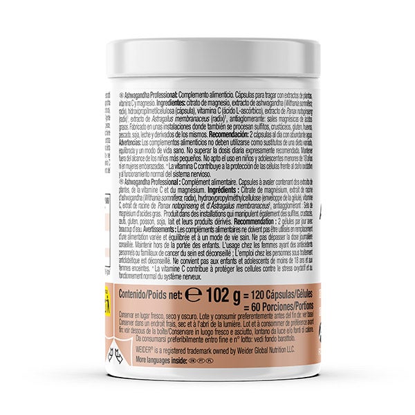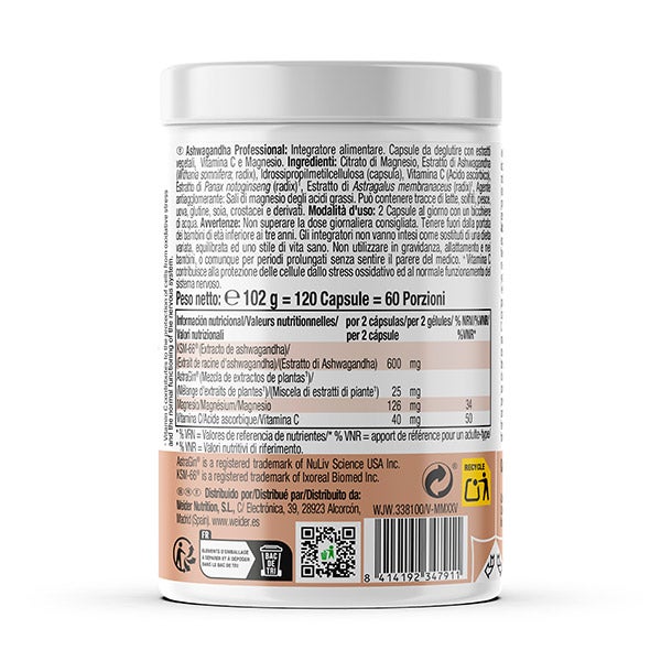 Citrato de magnesio, extracto de ashwagandha (Withania somnifera; radix), hidroxipropilmetilcelulosa (cápsula), vitamina C (ácido L-ascórbico), extracto de Panax notoginseng (radix)1, extracto de Astragalus membranaceus (radix)1, antiaglomerante: sales magnésicas de ácidos grasos.