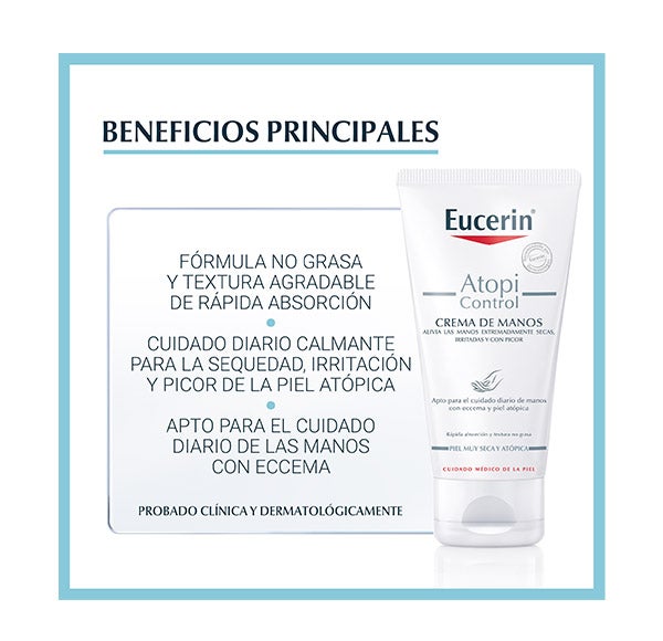 De rápida absorção Eucerin AtopiControl Creme para mãos melhora a condição da pele sem deixar uma sensação de gordura.