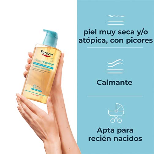 Contém mais de um 50% de óleos ômega e de outros óleos naturais, e seu alto conteúdo em óleos, amacia e protege a pele para evitar que aumente a secura, e alivia a coceira. Eucerin AtopiControl Oleogel de Banho é aplicado na pele úmida durante o banho ou o banho diário e é adequado para adultos, crianças e para bebês a partir dos três meses de idade. No entanto, com crianças, deve ser usado apenas como aditivo para o banho.
