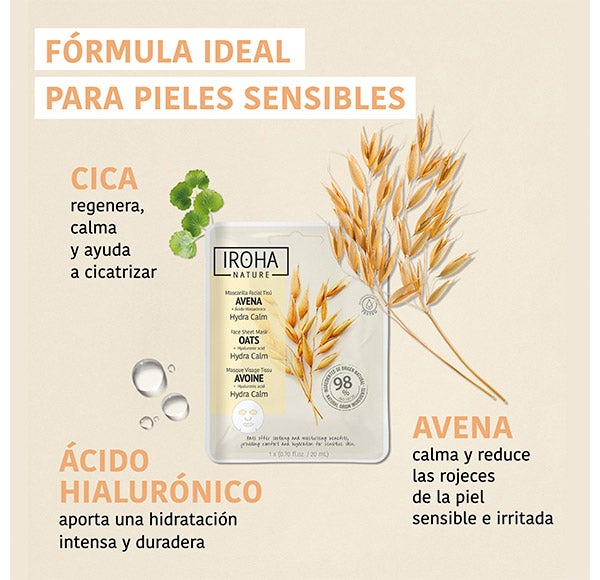 Entre seus ativos principais está a Aveia, que acalma e proporciona conforto imediato à pele sensível e irritada, reduzindo vermelhidão e melhorando a barreira cutânea. O Ácido Hialurônico, que graças às suas diferentes formas moleculares, hidrata intensamente e retém a umidade na superfície da pele. Além disso, contém CICA, que regenera a pele e extrato de pepino que não só refresca como também descongestiona a pele inflamada e danificada.