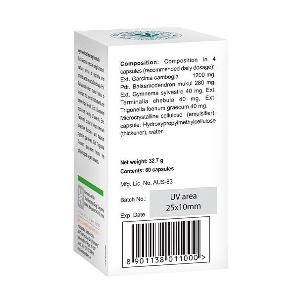 Ingredientes principais: Extrato de fruto de Garcinia cambogia, extrato de folha de Gymnema sylvestris, extrato de casca de Terminalia chebula, e extrato de semente de Trigonella foenum-graecum.