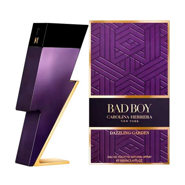 O frasco da fragrância Bad Boy Dazzling Garden é apresentado em uma elegante caixa roxa e dourada, que reflete os tons audaciosos desta edição especial para colecionadores.
