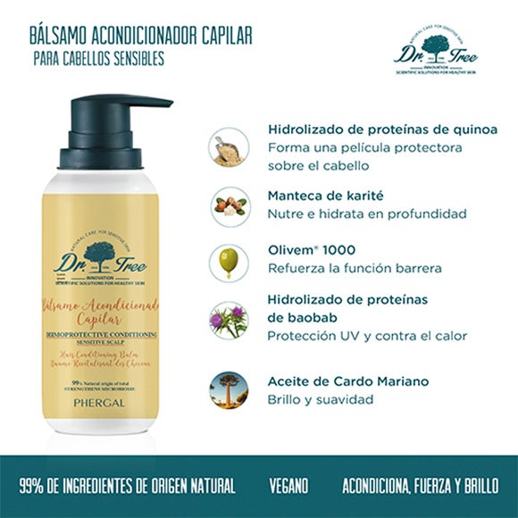 O bálsamo condicionador capilar do Dr. Tree restaura a barreira cutânea. O cabelo torna-se sedoso, suave e fácil de pentear graças aos seus ingredientes de origem natural como a Manteiga de Karité, o Óleo de Cardo Mariano, as Proteínas de Quinoa e as Proteínas de Baobab.