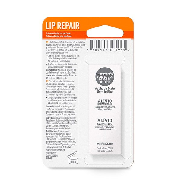 Com 7 hidratantes e condicionadores, o Lip Repair do O'Keeffe’s continua agindo mesmo enquanto você come e bebe.