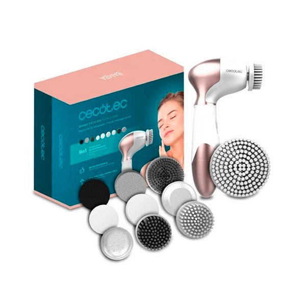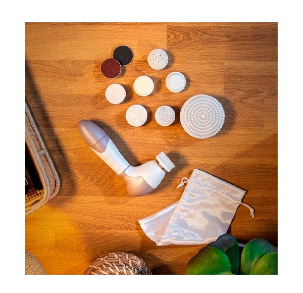 Escova facial com 9 cabeças para rosto, corpo e pés com rotação de 360º, um design ergonômico e com bolsa de viagem.