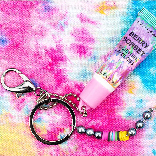Necessaire que inclui lipgloss e chaveiro.