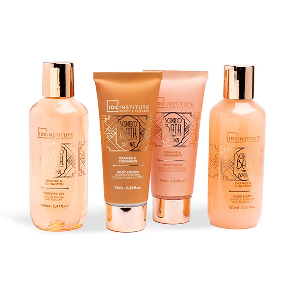 Esta bonita bandeja decorativa contém 4 dos seus produtos preferidos. Encontre um gel de banho, um banho de espuma, um esfoliante e um creme corporal, todos perfumados com uma suave e doce fragrância de laranja e canela.