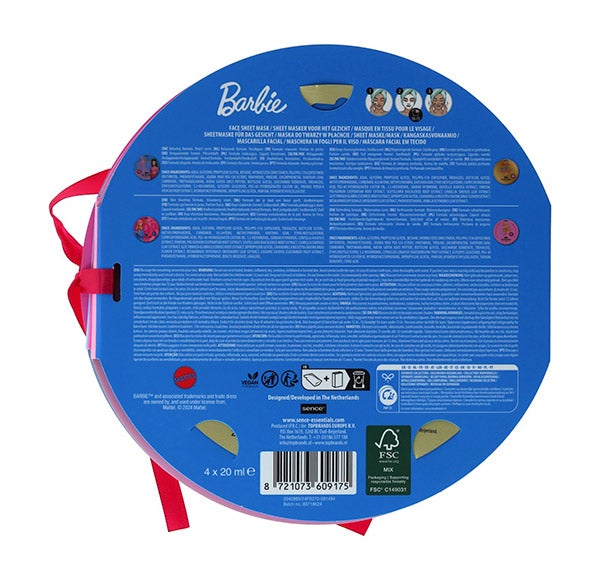 Reúna suas amigas para se divertir com máscaras. O jogo de máscaras faciais da Barbie de Sence inclui quatro máscaras estampadas que não apenas transformam seu rosto em um aspecto radiante, mas também enchem sua noite de risos e alegria.