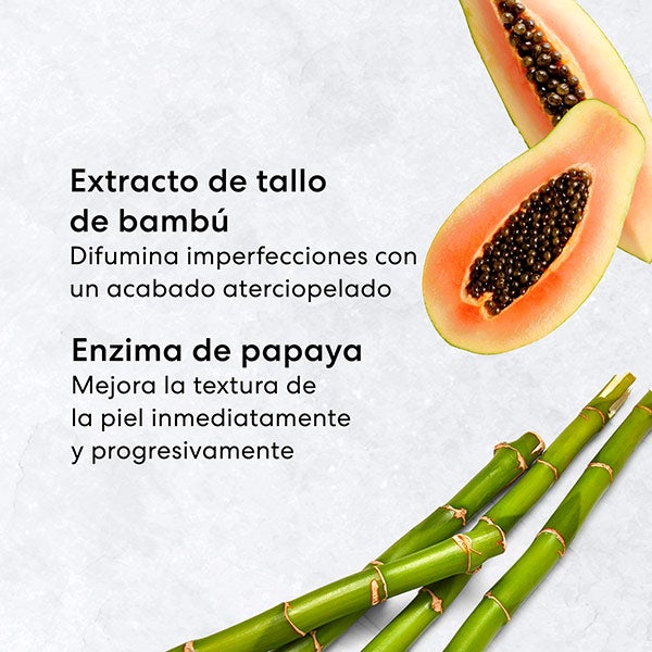Sua fórmula com tratamento melhora progressivamente a textura da pele e suaviza poros e imperfeições. Fluido luxuosamente cremoso com extrato de caule de bambu, para um acabamento naturalmente mate e aveludado, e enzimas de mamão que refinam a textura da pele instantaneamente e após seu uso contínuo.