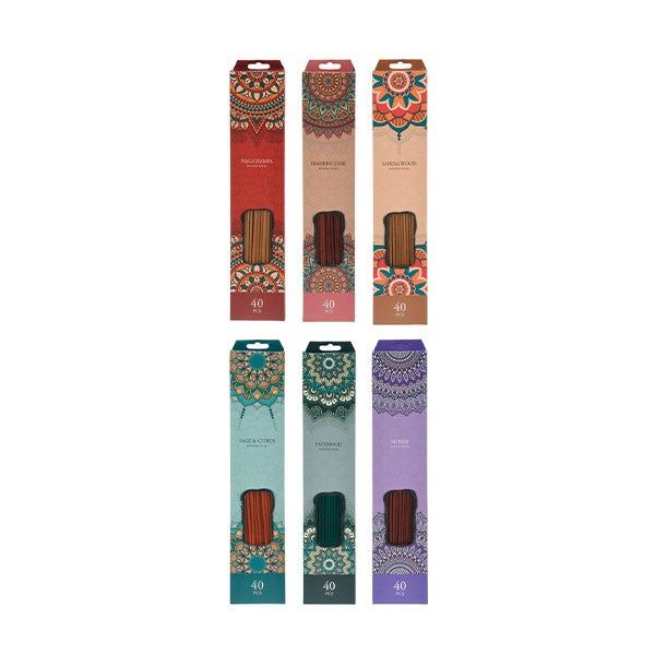 *6 AROMAS VARIADOS: INCENSO, NAG CHAMPA, PATCHOULI, SÂNDALO, SÁLVIA E CÍTRICOS, MIRRA. Chegará conforme disponibilidade.