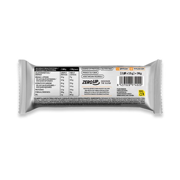 PREPARADO DE FIBRAS VEGETALES (42%) (FIBRA DE ACHICORIA, FIBRA VEGETAL), COBERTURA DE CHOCOLATE CON LECHE CON EDULCORANTE (30%) [EDULCORANTE (MALTITOL), MANTECA DE CACAO, LECHE EN POLVO (17%), PASTA DE CACAO, EMULGENTE (LECITINA DE GIRASOL), AROMA NATURAL DE VAINILLA], MANTECA DE KARITÉ, PROTEÍNA DE SOJA, PROTEÍNA DE GARBANZO, SAL MARINA, EMULGENTE (LECITINA DE GIRASOL), AROMA, EDULCORANTES (GLUCÓSIDOS DE ESTEVIOL PROCEDENTES DE ESTEVIA, GLUCÓSIDOS DE ESTEVIOL GLUCOSILADOS). CONTIENE AZÚCARES NATURALMENTE PRESENTES. PUEDE CONTENER TRAZAS DE CEREALES QUE CONTIENEN GLUTEN Y FRUTOS DE CÁSCARA. UN CONSUMO EXCESIVO PUEDE PRODUCIR EFECTOS LAXANTES.