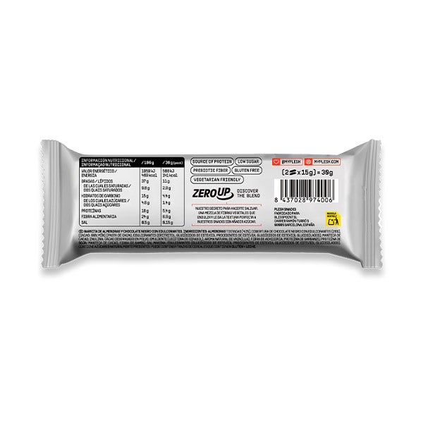 ALMENDRAS TOSTADAS (42%), COBERTURA DE CHOCOLATE NEGRO CON EDULCORANTES (25%), (CACAO: 60% MÍN) [PASTA DE CACAO, EDULCORANTES (ERITRITOL, GLUCÓSIDOS DE ESTEVIOL PROCEDENTES DE ESTEVIA, GLUCÓSIDOS DE ESTEVIOL GLUCOSILADOS), MANTECA DE CACAO, INULINA, CACAO DESGRASADO EN POLVO, EMULGENTE (LECITINA DE GIRASOL), AROMA NATURAL DE VAINILLA], FIBRA DE ACHICORIA, PROTEÍNA DE GARBANZO,PROTEÍNA DE SOJA, MANTECA DE CACAO, FIBRA DE BAMBÚ, SAL MARINA, EDULCORANTES (GLUCÓSIDOS DE ESTEVIOL PROCEDENTES DE ESTEVIA, GLUCÓSIDOS DE ESTEVIOL GLUCOSILADOS). CONTIENE AZÚCARES NATURALMENTE PRESENTES. PUEDE CONTENER TRAZAS DE CEREALES QUE CONTIENEN GLUTEN Y LECHE.