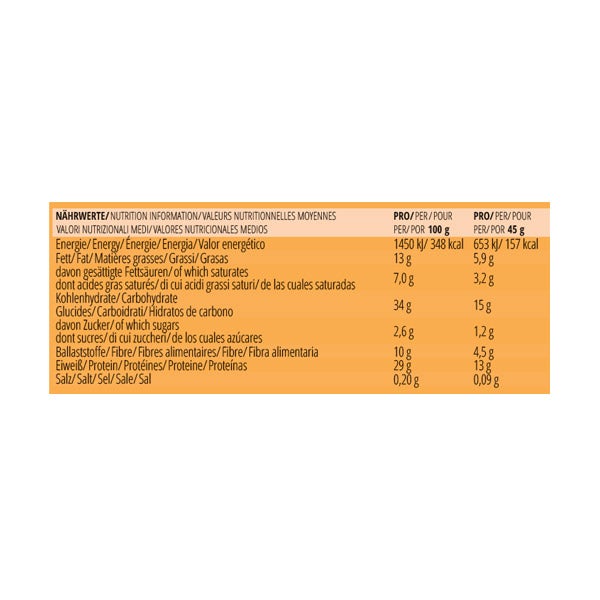 Proteínas de la leche, chocolate con leche con edulcorante (25%) (edulcorante (maltitol), mantequilla de cacao, leche entera en polvo, pasta de cacao, emulgente (lecitinas), aroma natural de vainilla), humectante (glicerina), agente de carga (polidextrosa), fibra de maíz soluble, agua, bolitas crujientes de proteína de leche (4%) (harina de arroz, proteínas de la leche), chocolate con edulcorante (pasta de cacao, edulcorante (maltitol), manteca de cacao, emulgente (lecitinas), aroma natural de vainilla), aceite de girasol, chocolate blanco con edulcorante (edulcorante (maltitol), manteca de cacao, leche entera en polvo, emulgente (lecitinas), aroma natural de vainilla), aromas, cacao desgrasado en polvo, sal marina, edulcorante (sucralosa).