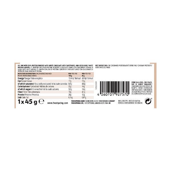 Uma sofisticada mistura de cremoso chocolate branco e robusto mocha, coberta com nibs de cacau crocantes, perfeita para obter aquele delicioso sabor de café, sem cafeína.