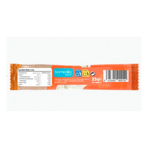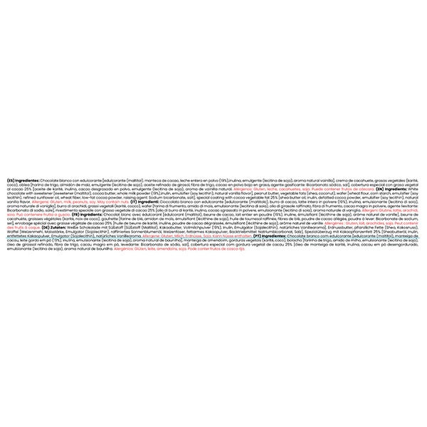 Chocolate con leche y edulcorante [edulcorante (maltitol), manteca de cacao, leche entera en polvo (17%), pasta de cacao, emulgente (lecitina de soja), aroma natural vainilla], crema de cacahuete, grasas vegetales (karité, coco), oblea [harina de trigo, almidón de maíz, emulgente (lecitina de soja), aceite refinado de girasol, fibra de trigo, cacao en polvo bajo en grasa, agente gasificante: Bicarbonato sódico, sal], cobertura especial con grasa vegetal al cacao 25% [aceite de karité, inulina, cacao desgrasado en polvo, emulgente (lecitina de soja), aroma de vainilla natural].
