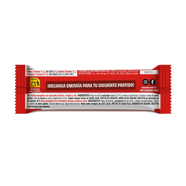 Pasta de dátil, cacahuete tostado (20%), creatina monohidrato, L-tirosina, harina de avena (GLUTEN), clara de huevo en polvo, bisglicinato de zinc.
