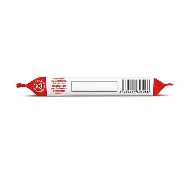 Proteína de la LECHE [proteínas de la LECHE, emulgente: lecitinas (SOJA)], chocolate blanco con edulcorantes cacao: 29% mínimo [edulcorante: maltitol, manteca de cacao, LECHE entera en polvo, emulgente: lecitinas (SOJA), edulcorante: acesulfamo potásico, aroma] (19%), crema sabor avellana y cacao con edulcorante [edulcorante: jarabe de maltitol, maltodextrina, manteca de coco, humectante: glicerina, LECHE entera en polvo, aromas, sal marina, emulgente: lecitina (SOJA), pasta de cacao, conservador: sorbato potásico] (15%), humectante: jarabe de maltitol, jarabe de colágeno de cerdo [colágeno de cerdo, agua, conservador: sorbato potásico], humectante: jarabe de sorbitol, nuggets de SOJA al cacao [aislado de proteína de SOJA, cacao en polvo, almidón de tapioca], galleta de cacao con edulcorante [harina de TRIGO (GLUTEN), edulcorante: maltitol, aceite de girasol alto oleico, almidón de TRIGO (GLUTEN), cacao desgrasado en polvo 4,2%, gasificantes: carbonato de sodio y carbonato de amonio, sal, emulgente: lecitinas, aroma], aceite de girasol, aroma, emulgente: lecitina (SOJA)
