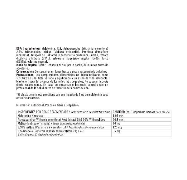 Melatonina, E.S. Ashwagandha (Withania somnifera) 2.5% Whithanolides, Melisa (Melissa officinalis) Pasiflora (Passiflora incarnata) Amapola de California (Eschscholzia californica) hierba, fosfato dicalcico dihidrato (E341), estearato magnésico vegetal (E70b), talco (E553b) gelatina vegetal.