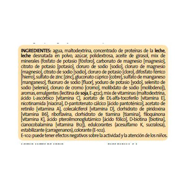 Agua, maltodextrina, concentrado de proteínas de la leche, leche desnatada en polvo, azúcar, polidextrosa, aceite de girasol, mix de minerales (fosfato de potasio (fósforo), carbonato de magnesio (magnesio), citrato de potasio (potasio), cloruro de sodio (sodio), cloruro de magnesio (magnesio), citrato de sodio (sodio), cloruro de potasio (cloro), difosfato férrico (hierro), sulfato de zinc (zinc), gluconato cúprico (cobre), sulfato de manganeso (manganeso), fluoruro de sodio (fluor), yoduro de potasio (yodo), selenito de sodio (selenio), cloruro de cromo (cromo), molibdato de sodio (molibdeno)), aromas, emulgentes (lecitina de soja, E-472c), mix de vitaminas (maltodextrina, ácido L-ascórbico (vitamina C), acetato de DL-alfa-tocoferilo (vitamina E), nicotinamida (niacina), D-pantotenato cálcico (ácido pantoténico), acetato de retinilo (vitamina A), colecalciferol (vitamina D), clorhidrato de piridoxina (vitamina B6), riboflavina, clorhidrato de tiamina (tiamina), filoquinona (vitamina K), ácido pteroilmonoglutámico (ácido fólico), D-biotina (biotina), cianocobalamina (vitamina B12), edulcorantes (acesulfamo K, sucralosa), estabilizante (carragenanos), colorante (E-102).