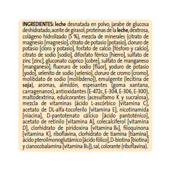 Leche desnatada en polvo, jarabe de glucosa deshidratado, aceite de girasol, proteínas de la leche, dextrosa, colágeno hidrolizado (5 %), mezcla de minerales (citrato de magnesio [magnesio], citrato de potasio [potasio], cloruro de potasio [cloro y potasio], fosfato de calcio [fósforo y calcio], citrato de sodio [sodio], difosfato férrico [hierro], sulfato de zinc [zinc], gluconato cúprico [cobre], sulfato de manganeso [manganeso], fluoruro de sodio [flúor], yoduro de potasio [yodo], selenito de sodio [selenio], cloruro de cromo [cromo], molibdato de sodio [molibdeno]), emulgente (lecitina de soja), aromas, almidón, espesantes (goma xantana, carragenanos), antioxidantes (E-472c, E-304, E-306, E-300), maltodextrina, edulcorantes (acesulfamo K y sucralosa), mezcla de vitaminas (ácido L-ascórbico [vitamina C], acetato de DL-alfa-tocoferilo [vitamina E], nicotinamida [niacina], D-pantotenato cálcico [ácido pantoténico], acetato de retinilo [vitamina A], colecalciferol [vitamina D], clorhidrato de piridoxina [vitamina B6], filoquinona [vitamina K], riboflavina, clorhidrato de tiamina [tiamina], ácido pteroilmonoglutámico [ácido fólico], D-biotina [biotina] y cianocobalamina [vitamina B12]), sal, colorante (riboflavina).