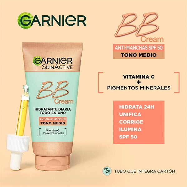 A BB Cream Anti-manchas SPF50 da Garnier é um cuidado que apresenta uma tecnologia tudo-em-um: graças à glicerina de origem vegetal hidrata intensamente, os pigmentos minerais uniformizam nossa pele e a vitamina E possui poder antioxidante, combinando assim todos os passos de beleza em um único gesto, e oferecendo além disso um cuidado a longo prazo graças à sua proteção solar.