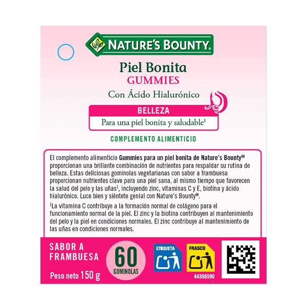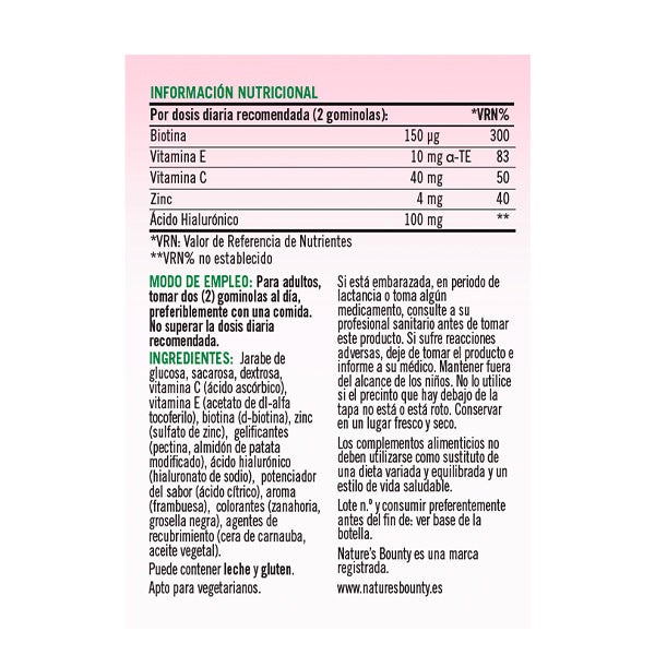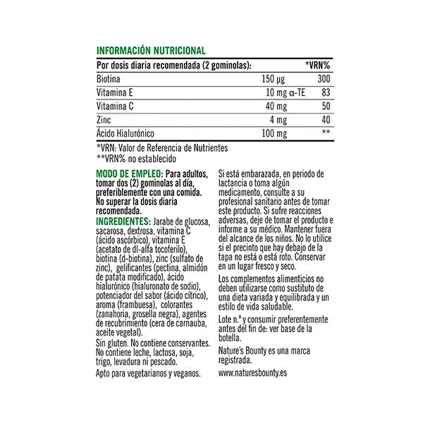 Jarabe de glucosa, sacarosa, dextrosa, vitamina C (ácido ascórbico), vitamina E (acetato de dl-alfa tocoferilo), biotina (d-biotina), zinc (sulfato de zinc), gelificantes (pectina, almidón de patata modificado), ácido hialurónico (hialuronato de sodio), potenciador del sabor (ácido cítrico), aroma (frambuesa), colorantes (zanahoria, grosella negra), agentes de recubrimiento (cera de carnauba, aceite vegetal)