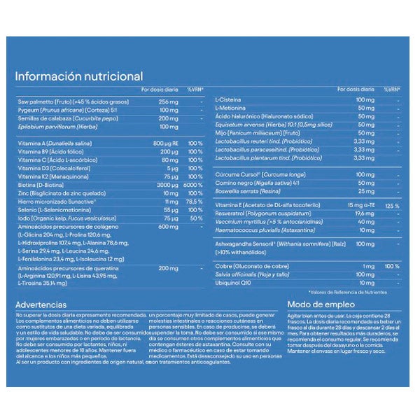 Agua; Humectante (glicerina); Fructosa de uva; Aminoácidos precursores de colágeno (L-glicina, L-prolina, L-hidroxiprolina, L-alanina, L-serina, L-leucina, L-fenilalanina, L-isoleucina); Ext. de Saw palmetto (Serenoa repens, fruto); Aminoácidos precursores de queratina (L-arginina, L-lisina y L-tirosina); Ext. de semillas de calabaza (Cucurbita pepo, semillas); Sunactive® hierro micronizado (pirofosfato férrico); Aromas; Cursol® ext. de cúrcuma (Curcuma longa, rizoma); Sensoril® ext. de ashwagandha (Withania somnifera, raíz); Ext. de Pygeum (Prunus africana, corteza); Ext. de Epilobium (Epilobium parviflorum, hierba); L-cisteína; Ext. de salvia (Salvia officinalis, hoja y tallo); Ácido L-ascórbico (vitamina C); Ext. de Fucus vesiculosus (0,1 % iodo), alga; Estabilizantes (celulosa microcristalina, sodio carboximetilcelulosa); Ext. de Dunaliella salina, alga (7,5 % b-caroteno); Ácido hialurónico (hialuronato de sodio); Ext. de cola de caballo (Equisetum arvense, hierba); Ext. de comino negro (Nigella sativa, semillas); Ext. de mijo (Panicum miliaceum, semilla); L-metionina; Estabilizante (sucroésteres de ácidos grasos); Acidulante (ácido cítrico); Ext. de arándano azul, >5 % antocianidinas (Vaccinium myrtillus, fruto); Menaquinona (vitamina K2); Bisglicinato de zinc; Acetato de DL-alfa tocoferilo (vitamina E); Ext. de Boswellia (Boswellia serrata, resina); Conservadores (sorbato de potasio, sodio benzoato); Espesante (goma xantana); Ext. de Polygonum cuspidatum (98 % resvertarol); L-seleniometionina; Ubiquinol Q10; Ext. de Haematococcus pluvialis (astaxantina); Gluconato de cobre; Lactobacillus plantarum tindalizado; Lactobacillus paracasei tindalizado; Lactobacillus reuteri tindalizado; Biotina (D-biotina); Ext. de Cladonia rangiferina (colecalciferol); Ácido fólico (ácido pteroilmonoglutámico).