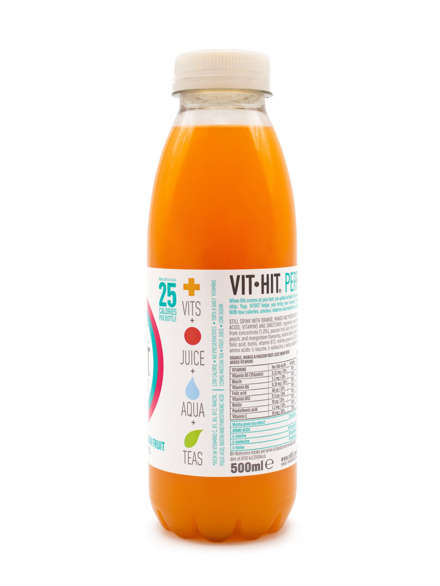 Agua, jugo de naranja a partir de concentrado (4,5 %), jugo de mango a partir de concentrado (1 %), jugo de maracuyá a partir de concentrado (0,5 %), ácido cítrico, saborizante natural, extracto de té verde matcha, antioxidante, ácido ascórbico, L-leucina, L-isoleucina, L-valina, sucralosa, mezcla de vitaminas (vitamina C, niacina, ácido pantoténico, vitamina B6, vitamina B1, ácido fólico, biotina, vitamina B12), colorantes carotenos y antocianinas, estabilizador goma de algarroba.