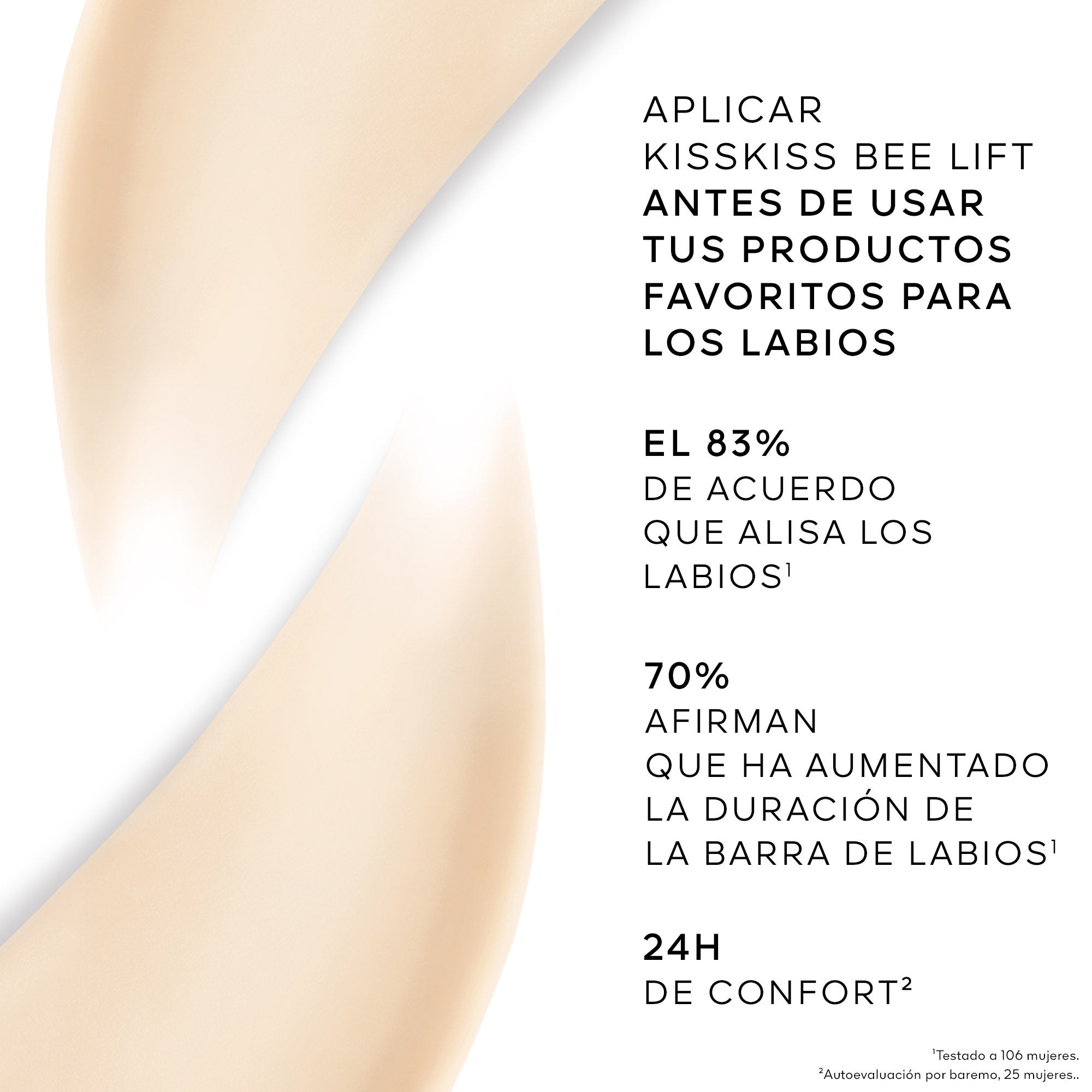 KissKiss Bee Lift, a base de tratamento universal composta por 95% de ingredientes de origem natural e enriquecida com mel da Córsega e cera de abelha, para lábios mais lisos e hidratados, prontos para a maquiagem.