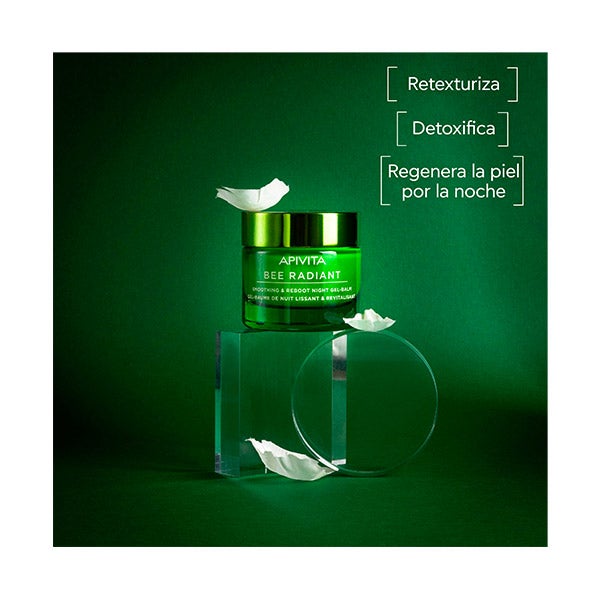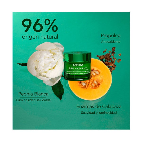Um bálsamo em gel revolucionário, com extrato de peônia branca, própolis patenteado e abóbora que transforma a pele durante a noite recuperando sua luminosidade graças a um peeling suave e sua ação restauradora.