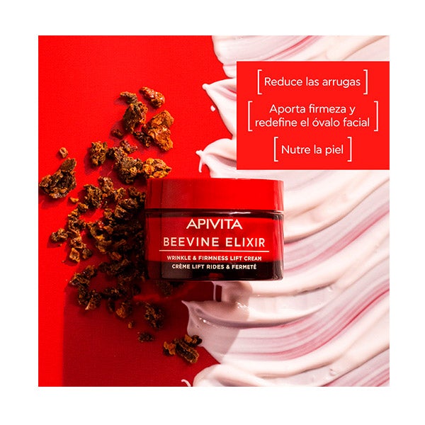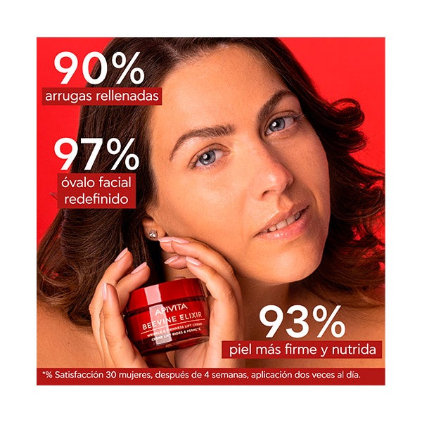 Preenche as rugas, proporciona um aspecto de pele mais firme e redefine o contorno facial graças aos polifenóis do própolis e da videira e o colágeno vegetal