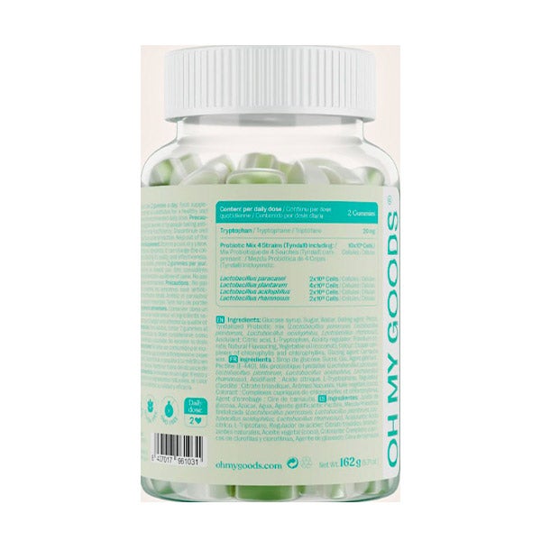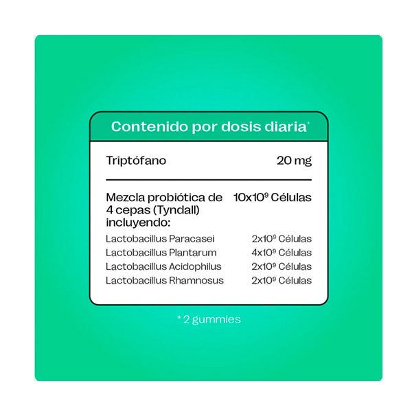 Jarabe de glucosa, Azúcar, Agua, Pectina, Mezcla Probiótica tindalizada (Lactobacillus paracasei, Lactobacillus plantarum, Lactobacillus acidophilus, Lactobacillus rhamnosus), Ácido cítrico, L-Triptófano, Citrato trisódico, Aromatizantes naturales, Aceite vegetal (coco), Complejos cúpricos de clorofilas y clorofilinas, Cera de carnauba.