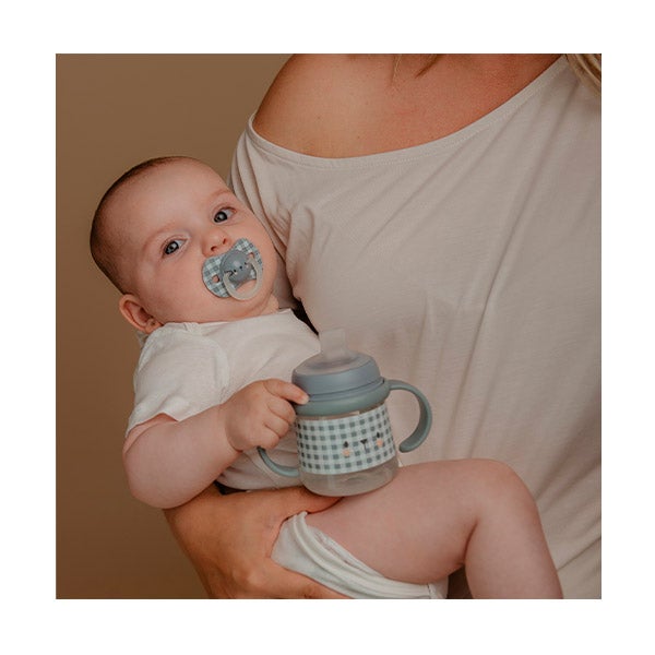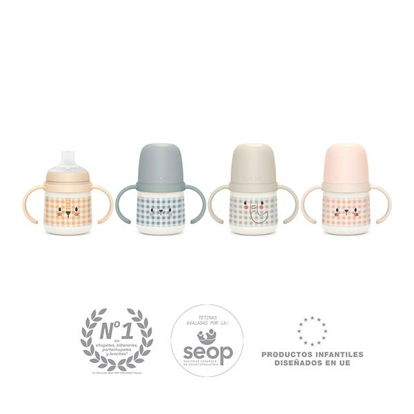Biberão First Suavinex com alças e bico de silicone, 150ml. Biberão de treino ideal para passar do biberão com tetina para as primeiras chávenas de treino de forma confortável e sem perceber. Ideal para bebês +6 meses.