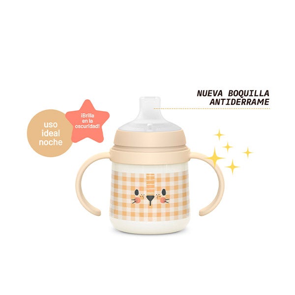 Este biberão com alças inclui um copo protetor para maior higiene.