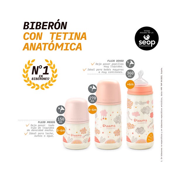 Bico Aprovado pela Sociedade Espanhola de Odontopediatria e recomendado pela Associação Italiana de Especialistas em Ortodontia. Este biberão conta com a nova garrafa Suavinex com forma reta que oferece uma pegada mais confortável para o bebê.