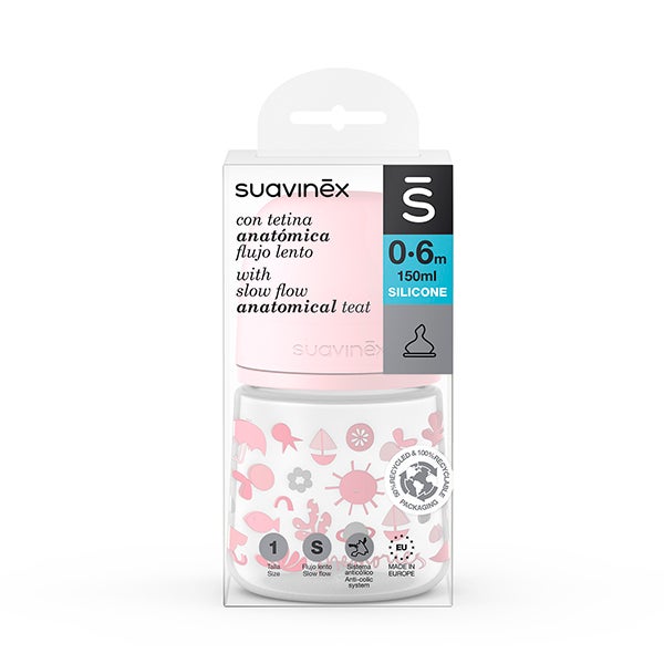 Biberão Suavinex para bebês 0-6 meses com bico anatômico fluxo médio de silicone. Capacidade 150ml.