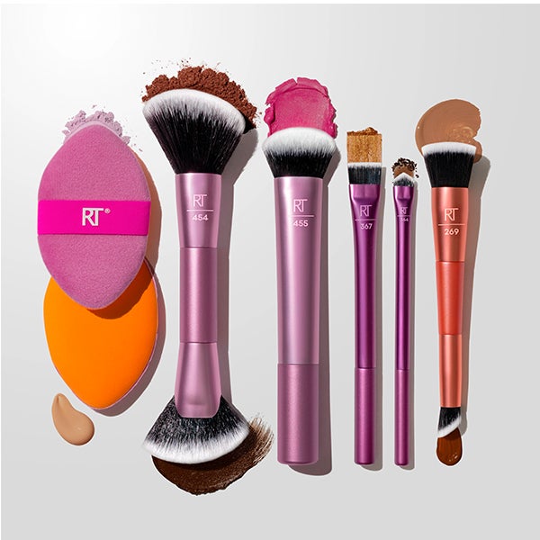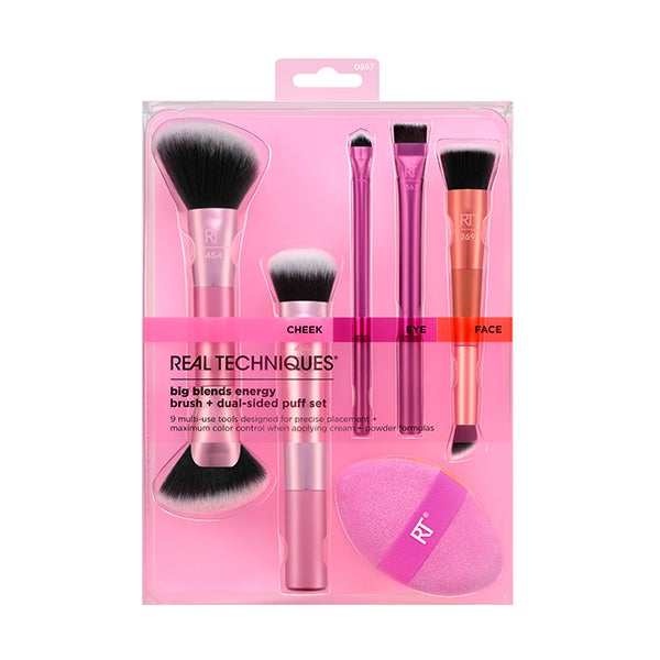 O conjunto de pincéis de maquiagem Big Blends Energy + esponja de dupla face da Real Techniques inclui 9 acessórios multiuso projetados para uma aplicação precisa e controle máximo da cor.