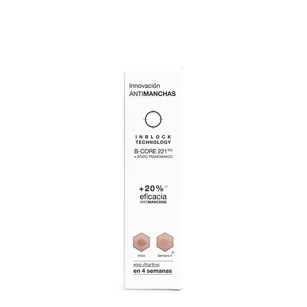 Reduz visivelmente todos os tipos de manchas escuras: manchas causadas pelo sol, idade, manchas hormonais e pós-inflamatórias. Com a tecnologia exclusiva INBLOCK TECHNOLOGY: uma combinação de B-CORE 221TM e Ácido Tranexâmico para tratar as manchas de maneira integral, atuando em todas as fases do processo de formação das manchas. Em apenas 4 semanas, as manchas se atenuam notavelmente para uma pele luminosa, uniforme e sem manchas.