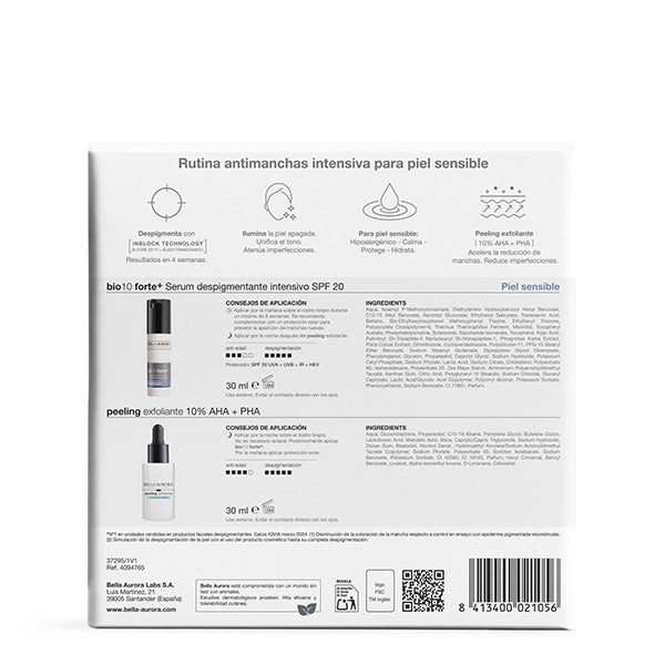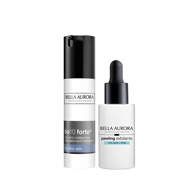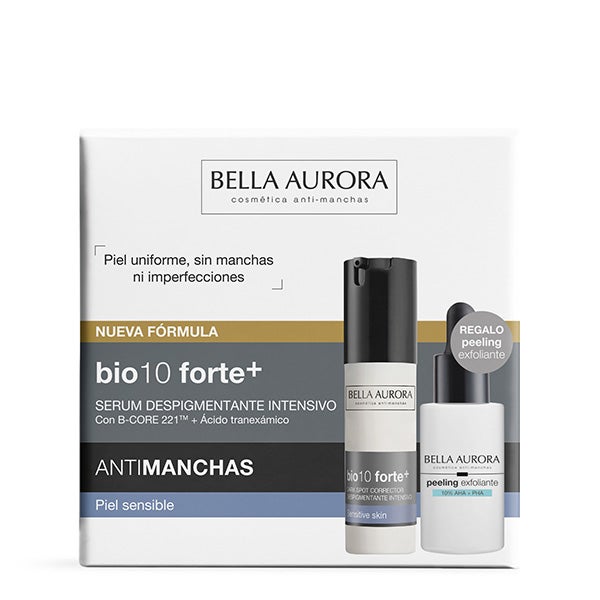 Neste estojo, você encontrará o sérum bio10 forte+ para pele sensível e o peeling esfoliante