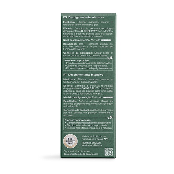 Eficácia: Combina a exclusiva tecnologia despigmentante B-CORE 221TM com extratos naturais à base de plantas para uma ação anti-manchas e iluminadora intensiva.