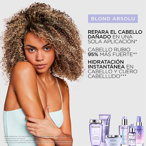 - Lave seu cabelo com o da gama Blond Absolu de Kérastase que melhor se adapte ao seu cabelo. Você pode escolher entre Bain Lumiére, Bain Ultra-Violet ou o novo Bain Cicaextreme.