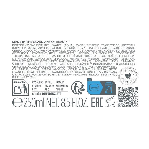INGREDIENTS/INGREDIENTES: WATER (AQUA), CAPRYLIC/CAPRIC TRIGLYCERIDE, GLYCERIN, BUTYROSPERMUM PARKII (SHEA) BUTTER EXTRACT, GLYCERYL STEARATE, PEG-100 STEARATE, CETEARYL ALCOHOL, PHENOXYETHANOL, FRAGRANCE (PARFUM), HYDROGENATED VEGETABLE GLYCERIDES, PENTAERYTHRITYL DISTEARATE, SODIUM POLYACRYLATE, TOCOPHEROL, TOCOPHERYL ACETATE, TETRASODIUM GLUTAMATE DIACETATE, ACRYLATES/BEHENETH-25 METHACRYLATE COPOLYMER, LINALOOL, HELIANTHUS ANNUUS (SUNFLOWER) SEED OIL, TETRAMETHYLACETYLOCTAHYDRO NAPHTHALENES (OTNE), LIMONENE, HEXYL CINNAMAL, SODIUM HYDROXIDE, LINALYL ACETATE, HEXAMETHYLINDANOPYRAN (GALAXOLIDE), CITRONELLOL, COUMARIN, ALPHA-ISOMETHYL IONONE, CITRUS AURANTIUM PEEL OIL, PINENE, CITRAL, BENZYL ALCOHOL, CITRUS AURANTIUM AMARA (BITTER ORANGE) FLOWER EXTRACT, LAVANDULA OIL/ EXTRACT, JUNIPERUS VIRGINIANA OIL, VANILLIN, POTASSIUM SORBATE, SODIUM BENZOATE, YELLOW 5 (CI 19140), BLUE 1 (CI 42090).