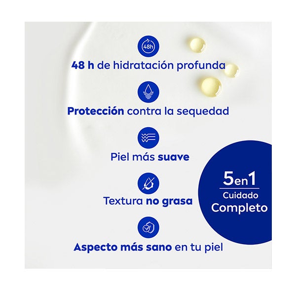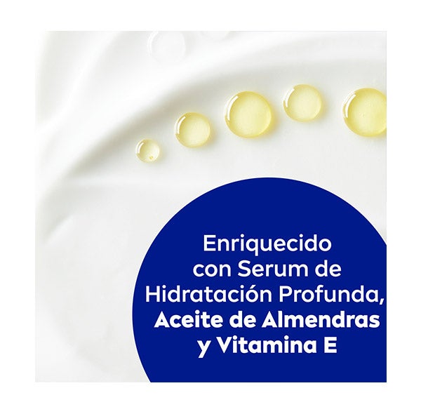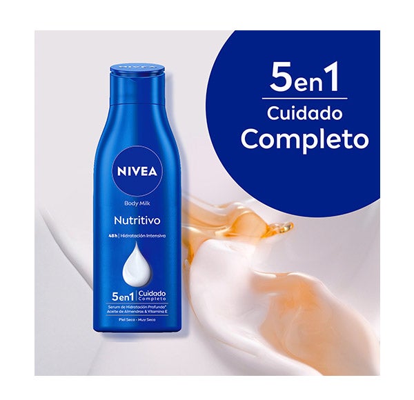 Consigue una hidratación profunda aplicándote NIVEA Body Milk Nutritivo sobre tu piel. Su cremosa fórmula con Aceite de Almendras nutre intensamente la piel seca o muy seca dejándola sedosa."