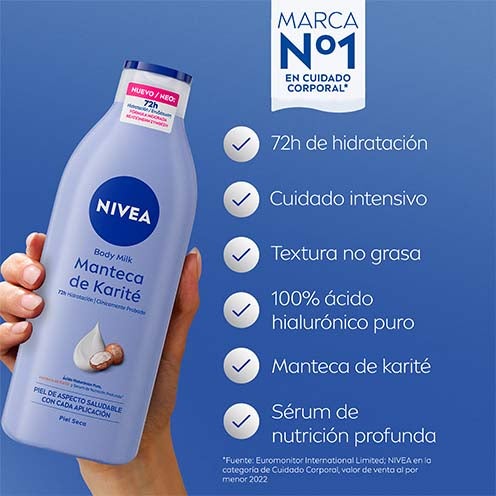 Transforme sua pele seca com NIVEA Body Milk Manteiga de Karité. Oferece à sua pele um cuidado completo 5 em 1: 48h de Hidratação Profunda, Proteção contra a secura, Sensação de suavidade na pele, Textura não gordurosa e Pele com aparência saudável. Infundido com ingredientes nutritivos valiosos como o Sérum de Hidratação Profunda e a Manteiga de Karité. A combinação única desses agentes hidratantes que existem naturalmente na pele, de lípidos que retêm a hidratação e de óleos nutritivos consegue ligar e reter a água na pele, evitando assim que a hidratação possa evaporar facilmente. Os métodos de teste mais recentes demonstraram que esta perfeita combinação de ingredientes de alta qualidade presentes nas loções da NIVEA, agora também unidos ao Sérum de Hidratação Profunda, conseguem penetrar na pele proporcionando uma hidratação profunda durante 48 horas.