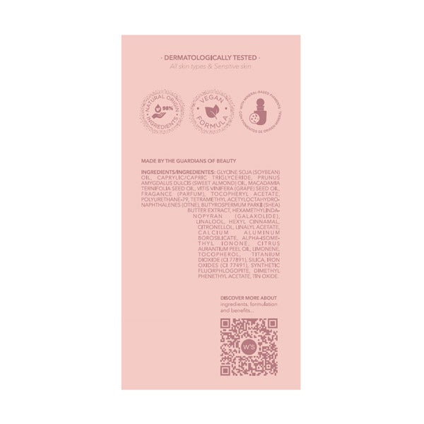 INGREDIENTS/INGREDIENTES: GLYCINE SOJA (SOYBEAN) OIL, CAPRYLIC/CAPRIC TRIGLYCERIDE, PRUNUS AMYGDALUS DULCIS (SWEET ALMOND) OIL, MACADAMIA TERNIFOLIA SEED OIL, VITIS VINIFERA (GRAPE) SEED OIL, FRAGANCE (PARFUM), TOCOPHERYL ACETATE, POLYURETHANE-79, TETRAMETHYL ACETYLOCTAHYDRONAPHTHALENES (OTNE), BUTYROSPERMUM PARKII (SHEA) BUTTER EXTRACT, HEXAMETHYLINDANOPYRAN (GALAXOLIDE), LINALOOL, HEXYL CINNAMAL, CITRONELLOL, LINALYL ACETATE, CALCIUM ALUMINUM BOROSILICATE, ALPHA-ISOMETHYL IONONE, CITRUS AURANTIUM PEEL OIL, LIMONENE, TOCOPHEROL, TITANIUM DIOXIDE (CI 77891), SILICA, IRON OXIDES (CI 77491), SYNTHETIC FLUORPHLOGOPITE, DIMETHYL PHENETHYL ACETATE, TIN OXIDE.