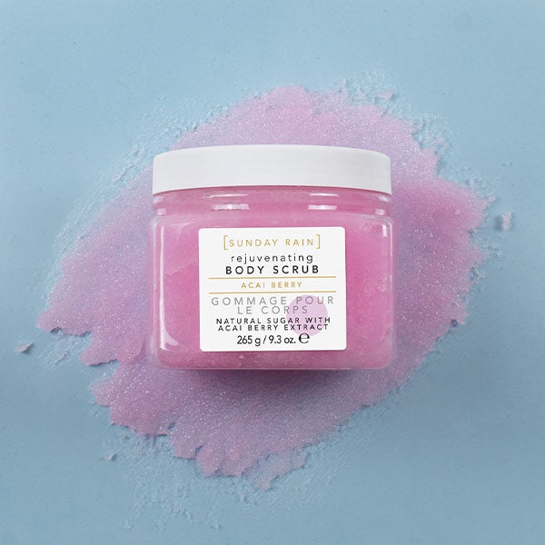 Faça uma leve massagem para suavizar a pele com este esfoliante de açúcar infundido com extrato de bagas de açaí.