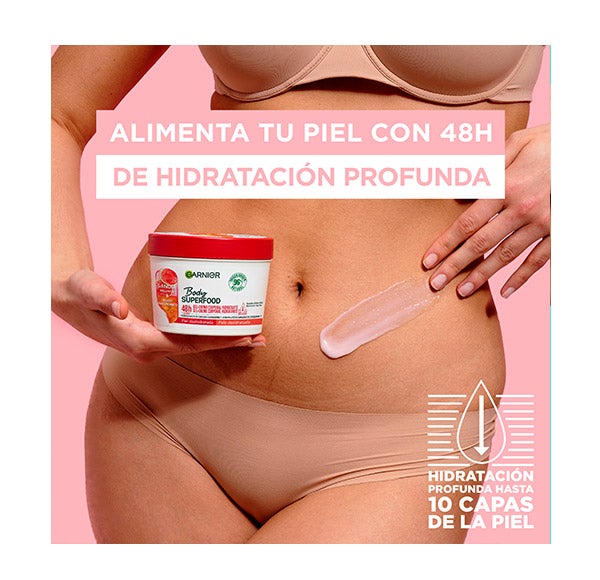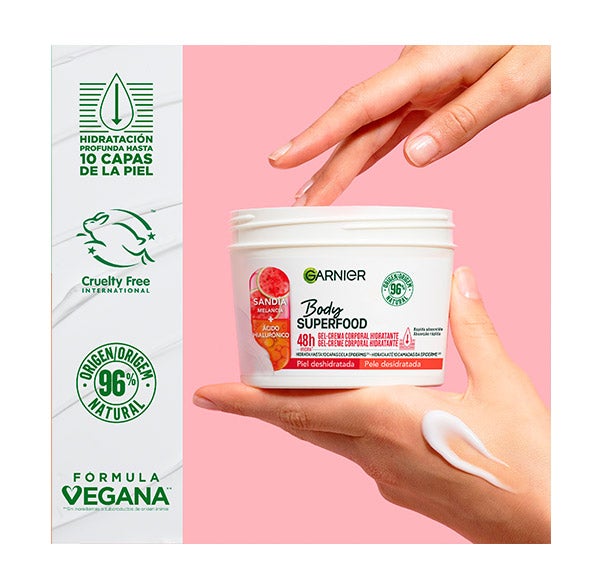 Garnier Body Superfood Creme Corporal Hidratante com Melancia e Ácido Hialurônico Para Peles Deshidratadas. Penetra até 10 camadas da epiderme hidratando e reforçando a barreira protetora da pele. Creme de absorção rápida hidratante 48h.